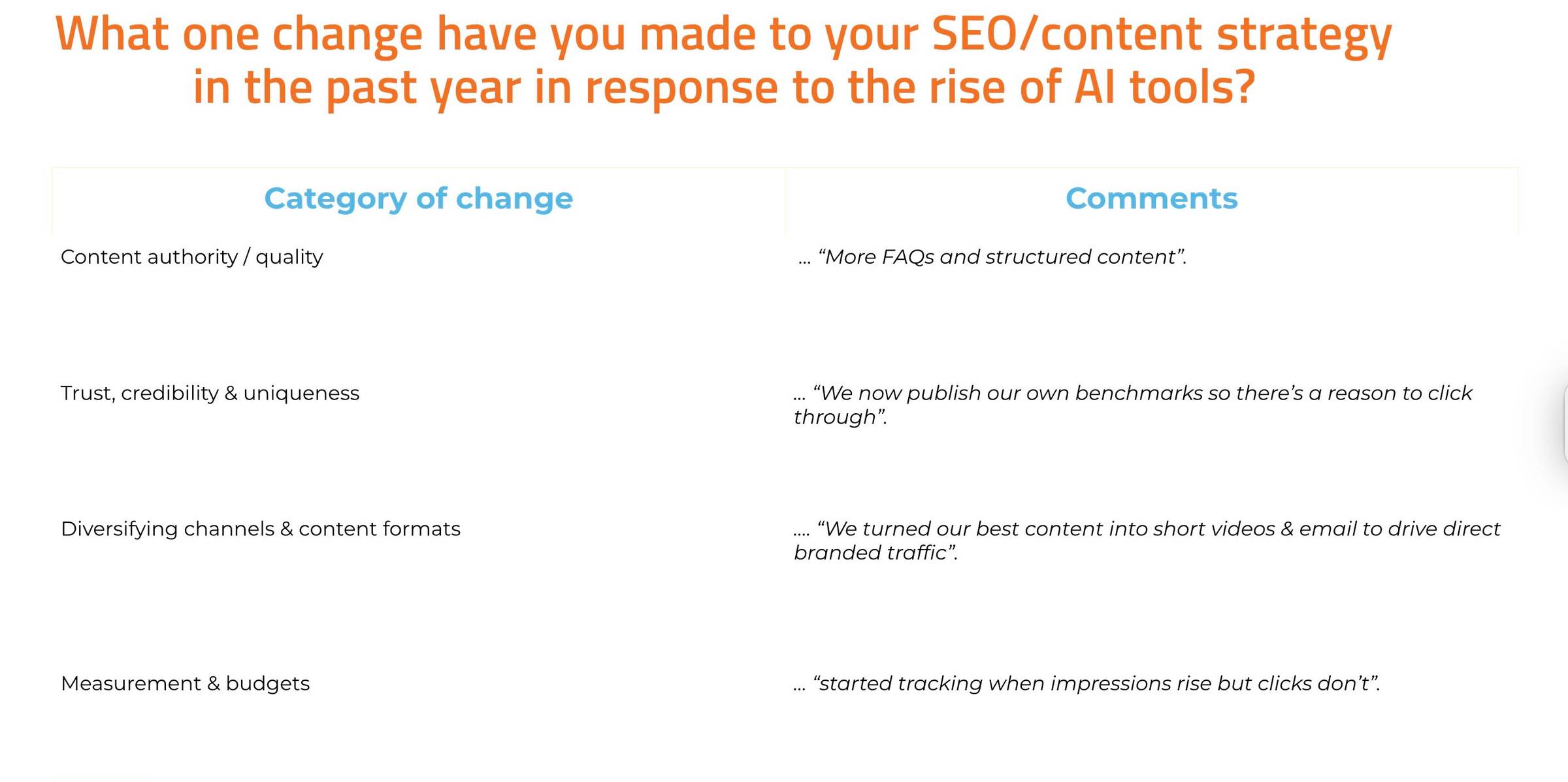 When we asked marketers what one change they’ve made to SEO or content in the age of AI, a clear theme emerged: don’t panic, get sharper. Some are levelling up authority with structured content and unique data that actually gives people a reason to click. Others are hedging their bets, turning top content into short videos and email to build traffic Google can’t intercept. And a growing group is watching the numbers differently — tracking when impressions rise but clicks don’t, a tell-tale sign that AI features are stepping in.