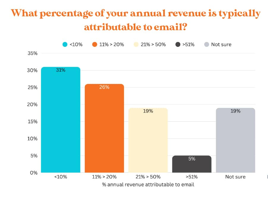 The maths on this is pretty simple: more than half of Australian businesses derive less than 20% of their income from email. A further 19% are unsure of emails revenue contribution. This suggests a couple of different scenarios: